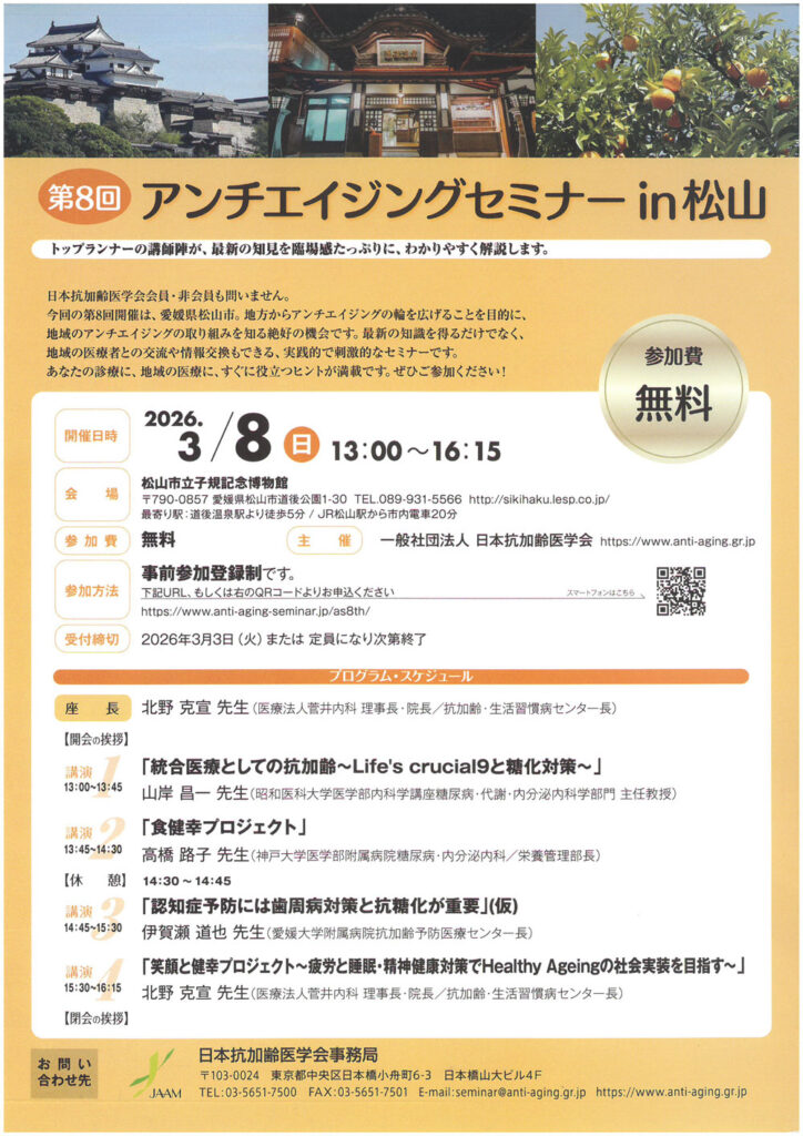 抗加齢医学界トップランナーの講師陣が松山に集結する、必見のセミナーのお知らせです。